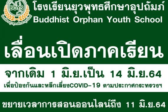 เลื่อนเปิดภาคเรียนจากเดิม 1 มิ.ย. เป็น 14 มิ.ย. 64 และ ขยายเวลาเรียนออนไลน์ จนถึงวันที่ 11 มิ.ย.64