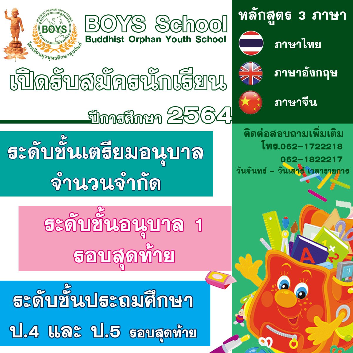 รับสมัครแล้วตั้งแต่วันนี้เป็นต้นไป (รับจำนวนจำกัด) วันจันทร์ – วันเสาร์ เวลา 8.00น. – 17.00น. โทร. 062 172 2217, 062 182 2218